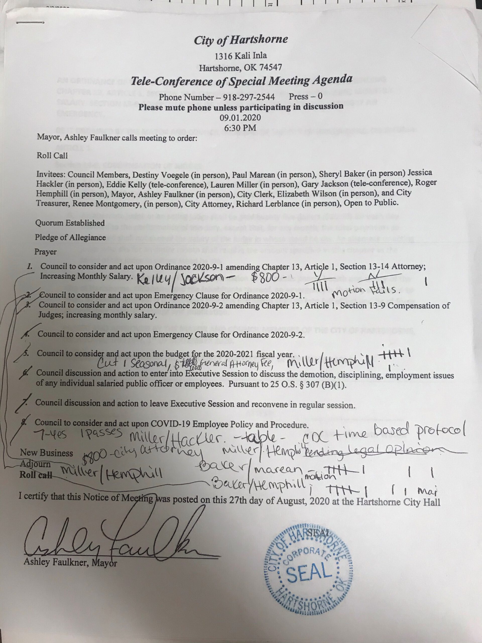 As the legislative branch of the City of Hartshorne government, the City Council holds open public meetings where local laws, policies, and basic decisions for the city are discussed and decided. City Council members are elected at large.